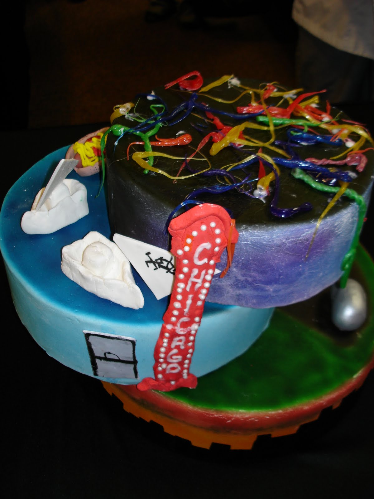 So, every year the culinary school has a symposium which is basically a day of workshops and lectures dealing with all things culinary related based on the theme for the year. This year's theme happened to be Chicago: Past, Present, and Future. Along with other duties, they put me in charge of organizing the cake competition this year. I decided, to make it really easy on everyone, to do styrofoam cakes with fondant. The challenge for the students was to keep within the theme (Chicago: My Kind of Town) and to make sure that everything on their cake was edible (no wood, metal, plastic, etc.) They worked in teams of two and we had 12 entries. I am really proud of all of them because this was their first time working with fondant (which is not easy to work with).